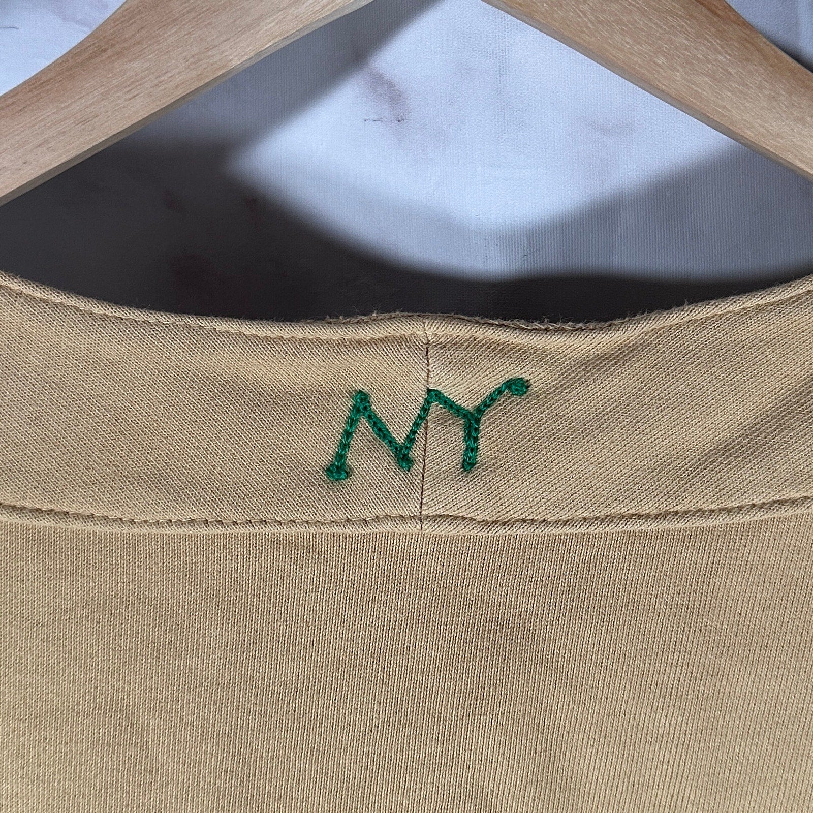 Made in USA, nice quality. Embroidered sleeve logo. Chain stitched ‘NY’ on neck.